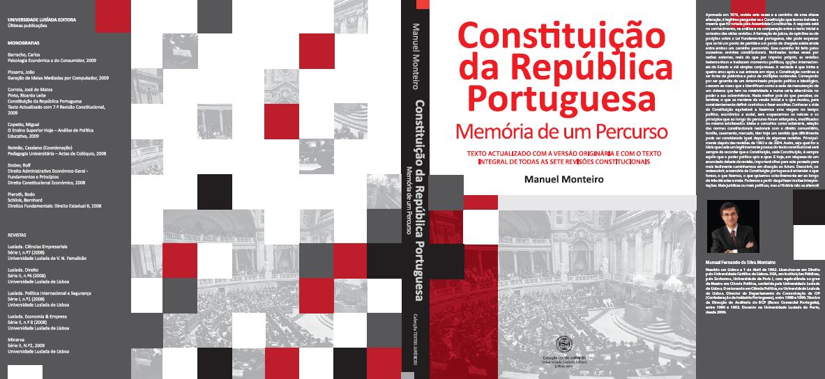 Na próxima 5ª feira, dia 14, pelas 18h~30m, na Universidade Lusíada, em Lisboa (Rua da Junqueira), faz-se a apresentação do livro CONSTITUIÇÃO PORTUGUESA - Memória de um Percurso, da autoria de Manuel Monteiro